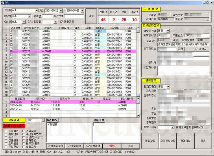 처리결과에 대한 중간 확인 시스템 상품 판매건/미판매건 조회, 수정, 갱신, 승인, 보류, 녹취내용 청취/지정, 코칭, QA기능